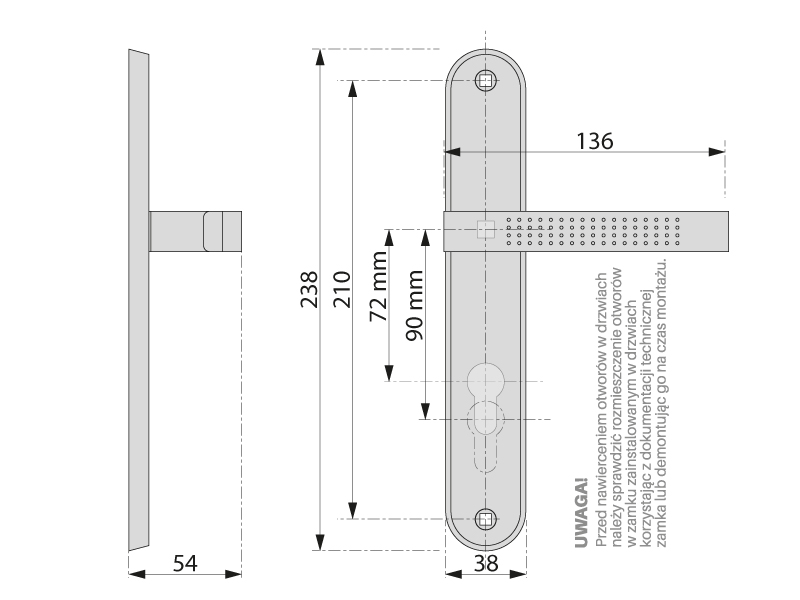 Rączka osadzona została na podłużnym szyldzie wykonanym ze stali. W ofercie znajdą Państwo wiele dostępnych rodzajów przebicia szyldu: klucz, wkładka, pokrętło WC.