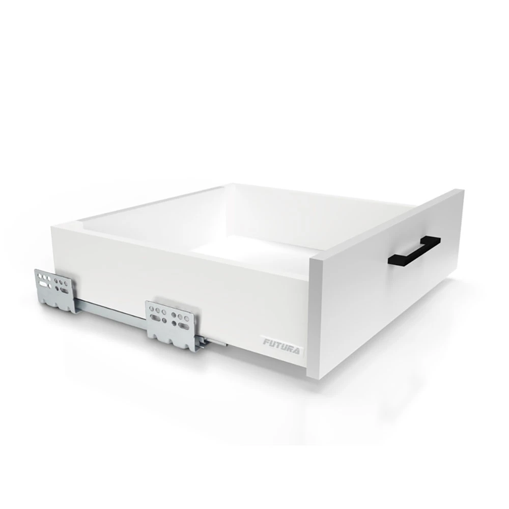 Szuflada FUTURA z wbudowaną prowadnicą TANDEM i cichym domykiem to nowoczesne rozwiązanie, które gwarantuje płynne i bezpieczne zamykanie szuflady. Mechanizm automatycznie spowalnia ruch, co zapobiega gwałtownemu zatrzaśnięciu, chroniąc elementy szuflady przed uszkodzeniami i eliminując nadmierny hałas.
