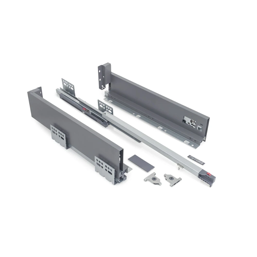 Szuflada FUTURA z wbudowaną prowadnicą TANDEM i cichym domykiem to nowoczesne rozwiązanie, które gwarantuje płynne i bezpieczne zamykanie szuflady. Mechanizm automatycznie spowalnia ruch, co zapobiega gwałtownemu zatrzaśnięciu, chroniąc elementy szuflady przed uszkodzeniami i eliminując nadmierny hałas.