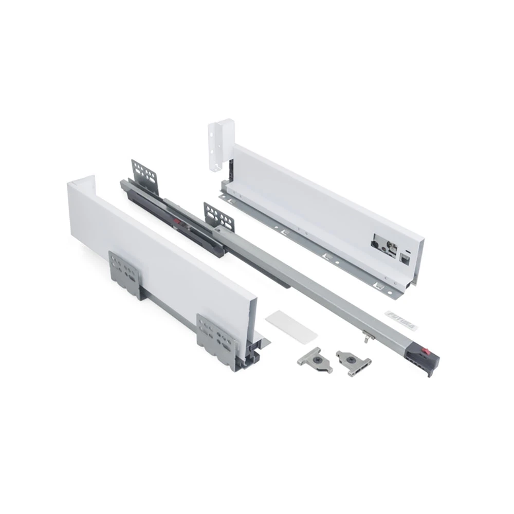 Szuflada FUTURA z wbudowaną prowadnicą TANDEM i cichym domykiem to nowoczesne rozwiązanie, które gwarantuje płynne i bezpieczne zamykanie szuflady. Mechanizm automatycznie spowalnia ruch, co zapobiega gwałtownemu zatrzaśnięciu, chroniąc elementy szuflady przed uszkodzeniami i eliminując nadmierny hałas.