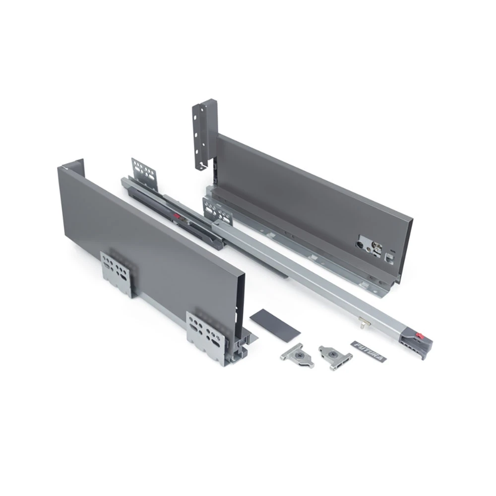 Szuflada FUTURA z wbudowaną prowadnicą TANDEM i cichym domykiem to nowoczesne rozwiązanie, które gwarantuje płynne i bezpieczne zamykanie szuflady. Mechanizm automatycznie spowalnia ruch, co zapobiega gwałtownemu zatrzaśnięciu, chroniąc elementy szuflady przed uszkodzeniami i eliminując nadmierny hałas.