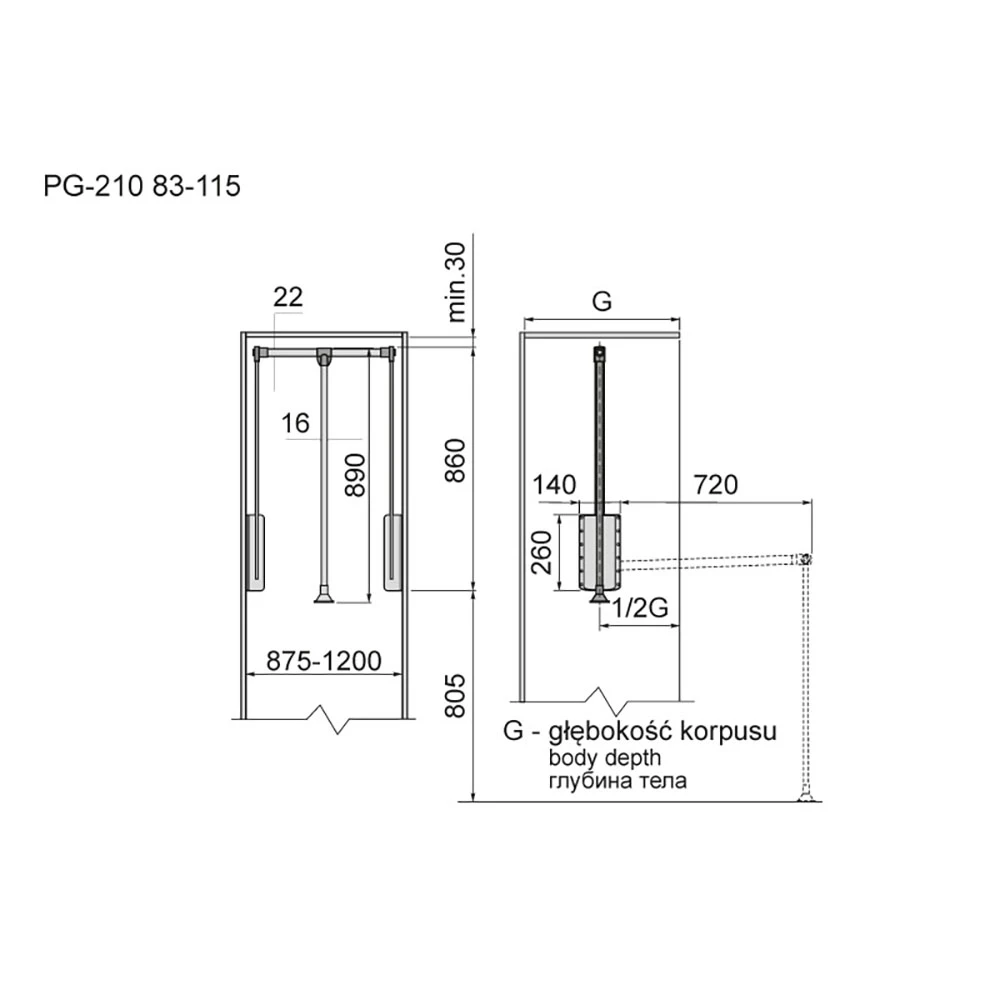 Model PG-210 w wersji 83-115 to idealne rozwiązanie dla szaf z wnękami o szerokości od 875 mm do 1200 mm.