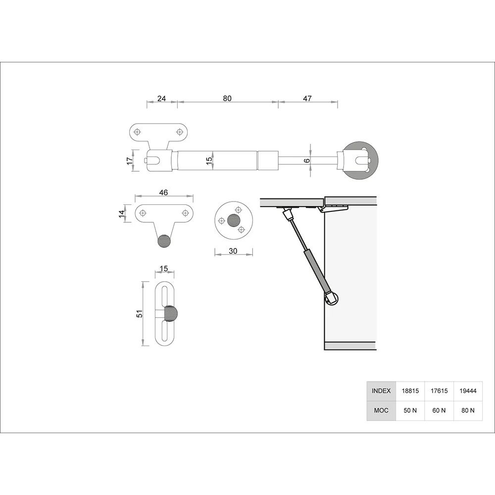 Podnośnik gazowy PG-015 60N do frontów meblowych i klap z regulacją szybkości otwierania