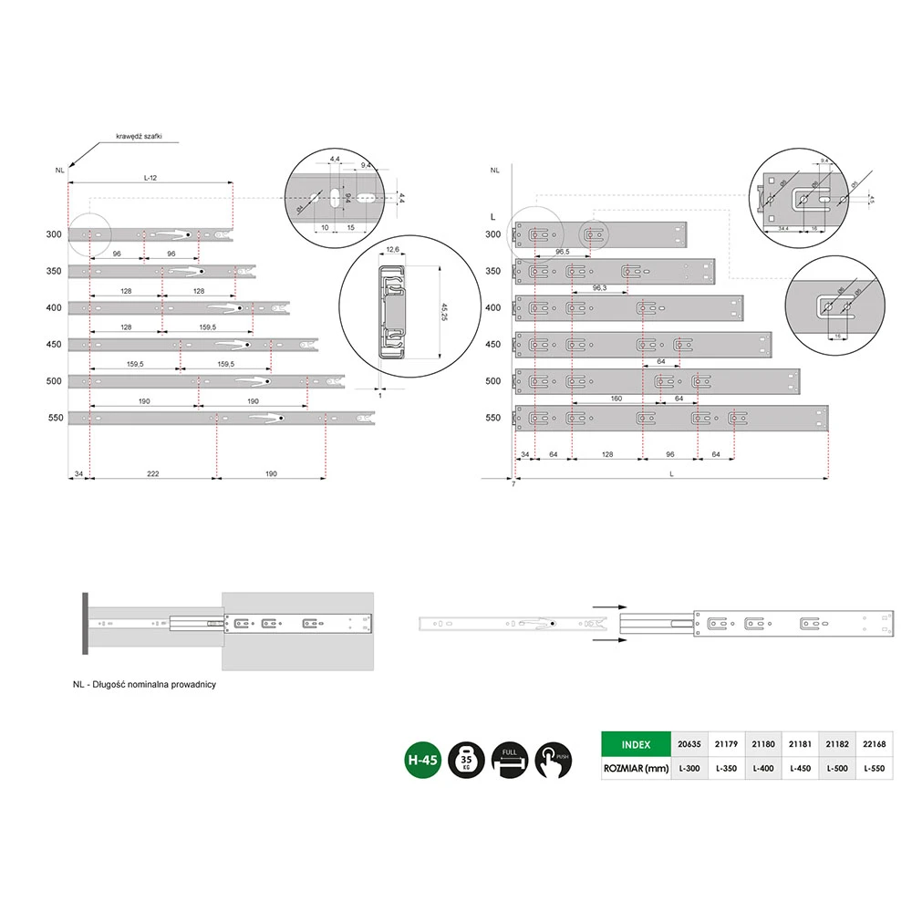 Stalowa prowadnica kulkowa PK-114 L-450 (450x12,6x45 mm) - Ładowność do 35 kg, pełny wysuw, system Push to Open