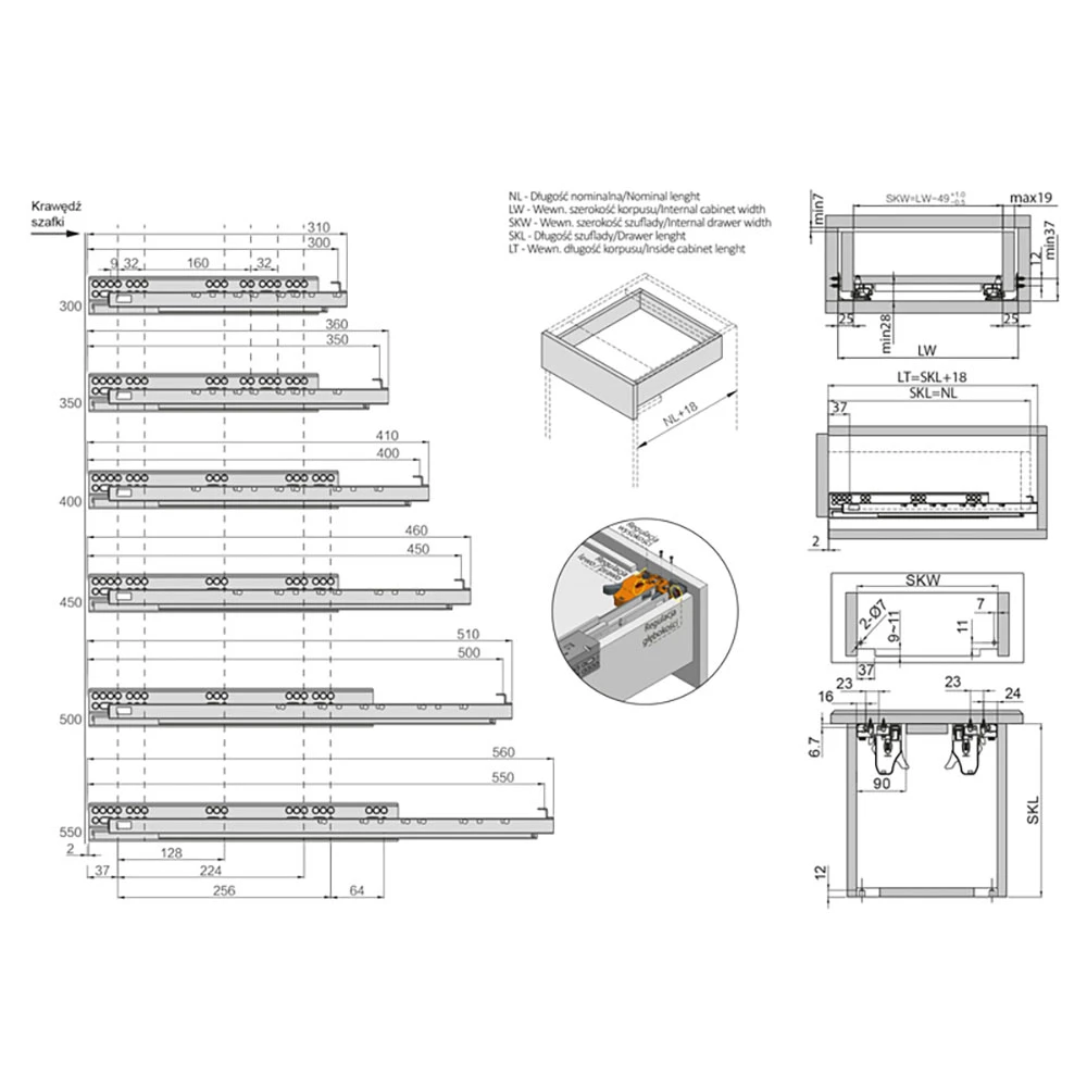 Prowadnice dolnego montażu TANDEM oferują wyjątkowy komfort z codziennego korzystania z mebli. Za sprawą ukrytego montażu, pozostają niewidoczne i nie zakłócą estetyki garderoby. Wysoka trwałość oraz jakość wykonania sprawiają, że są idealnym wyborem do każdej przestrzeni. Stosowane są do wszystkich szuflad drewnianych z płyty o grubości 16-18 mm (maksymalnie 19 mm).