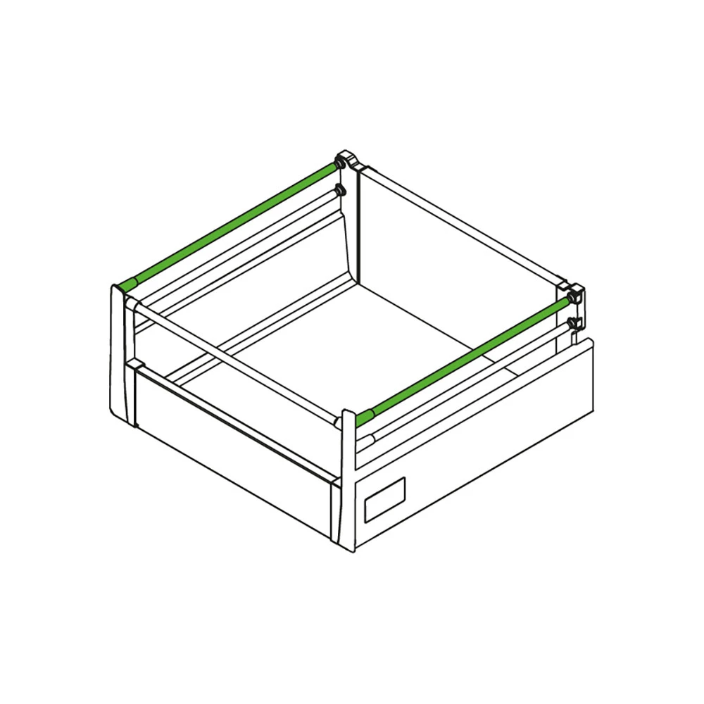 Reling wzdłużny do szuflad PREMIUM-BOX to kluczowy element montażowy wysokich szuflad. Jego główną funkcją jest zabezpieczenie zawartości szuflady przed przypadkowym wypadnięciem, co jest szczególnie istotne przy przechowywaniu cięższych, wyższych lub mniej stabilnych przedmiotów. Reling usztywnia również wysoki front szuflady, działając jako łącznik między frontem a tylnym mocowaniem. Dzięki temu front szuflady staje się bardziej stabilny i wytrzymały na codzienne użytkowanie.