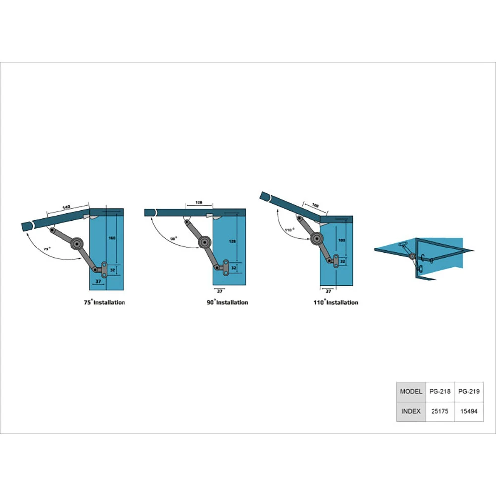 W zależności od miejsca montażu podnośnika wewnątrz szafki można uzyskać różne kąty otwarcia klapy: 75°, 90° lub 110°. Poszczególne kąty uzyskuje się poprzez montaż mocowania frontu w określonej odległości od korpusu mebla.