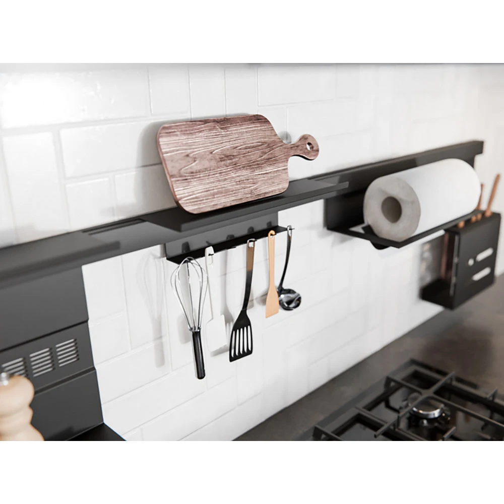 The RE-571 upper shelf is a practical solution that enhances kitchen organization. Made of steel in an elegant matte black finish, it seamlessly blends with modern interiors. Thanks to the slide-in mounting system in a specially prepared element along the entire profile, the shelf can be positioned anywhere, adapting to your needs. Its sturdy construction ensures safe storage of spices, kitchen accessories, or small tools, making the kitchen even more functional and organized.