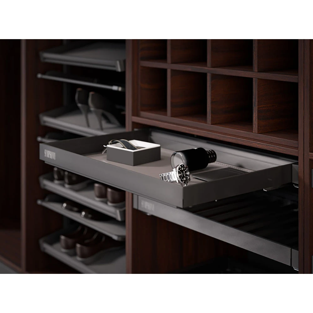The SYMPHONY shoe rack has an impressive maximum load capacity of up to 35 kg, allowing for the safe storage of shoes without compromising structural integrity. Its sliding system has been tested for 60,000 cycles, ensuring long product life, even with intensive use.