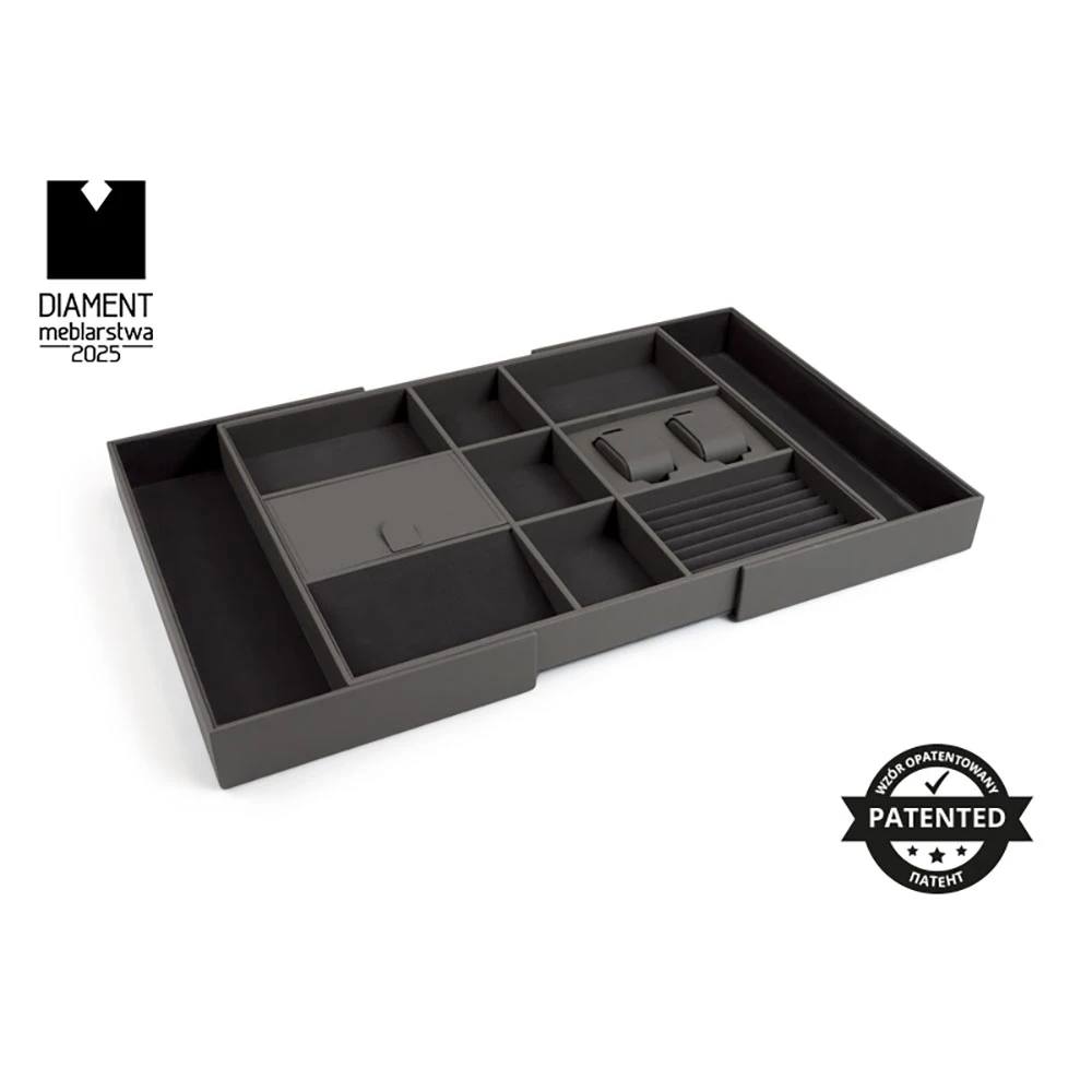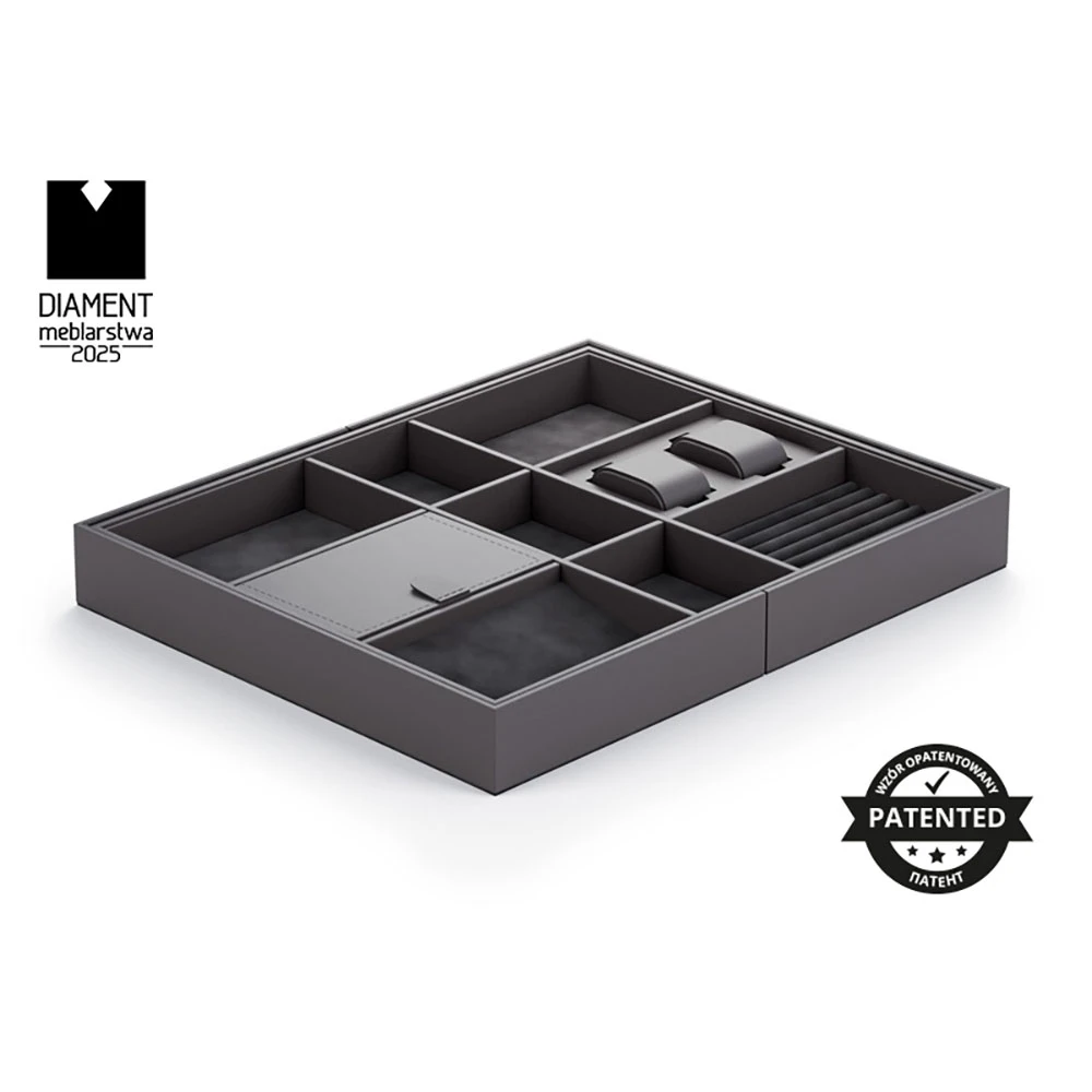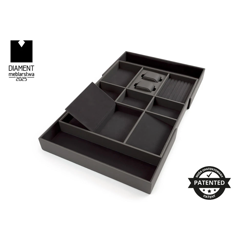 The WB-674 drawer organizer is a perfect solution for storing jewelry (rings, bracelets, and chains), watches, perfumes, or wallets in specially designed compartments. Its elegant design and sturdy construction fit perfectly into any interior, adding a luxurious and fresh appearance.
