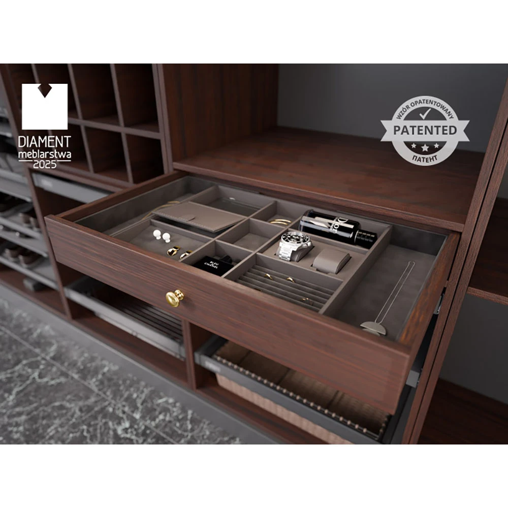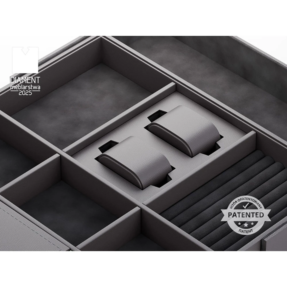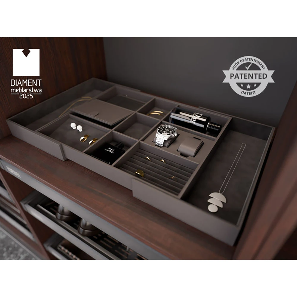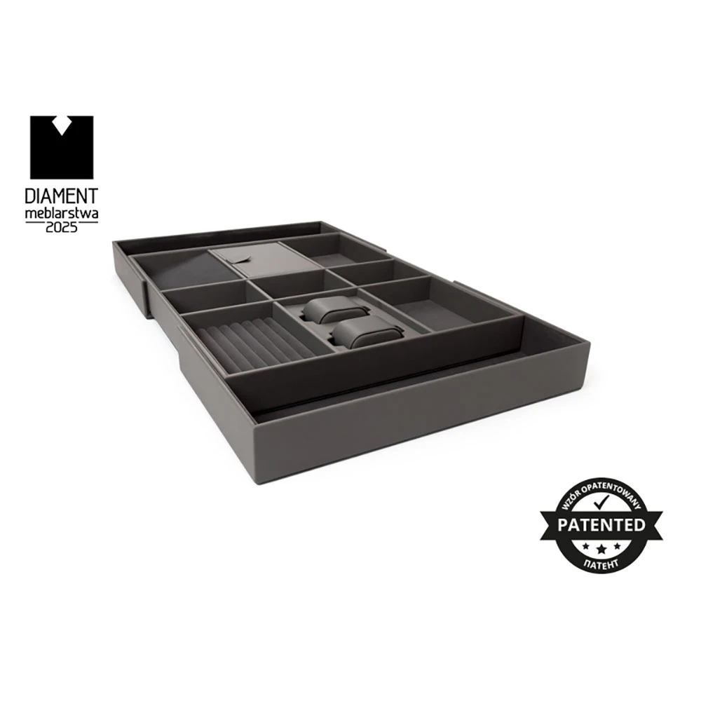 The WB-674 drawer organizer is a perfect solution for storing jewelry (rings, bracelets, and chains), watches, perfumes, or wallets in specially designed compartments. Its elegant design and sturdy construction fit perfectly into any interior, adding a luxurious and fresh appearance.