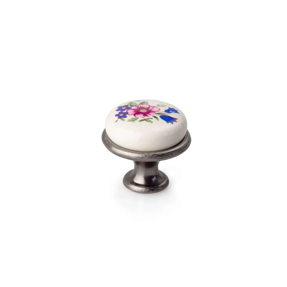 Cabinet Knob, Cupboard Door Knob in Silver Finish - White Porcelain with Flower Bouquet Design - Vintage Style