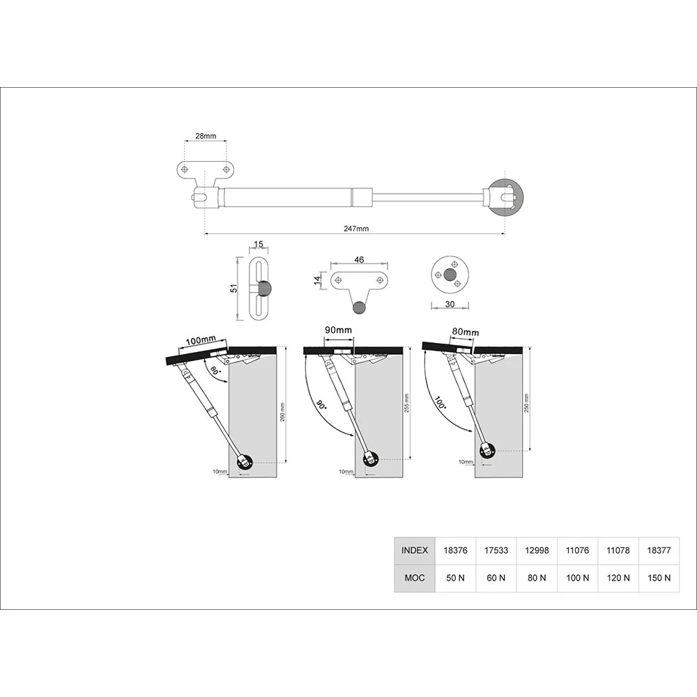 The PG-010 gas lift by ATM offers precise adjustment of the opening angle, allowing the position of furniture fronts to be set between 80° and 100°. This adjustability ensures that the user can customize the front settings to their specific needs, improving the comfort of daily furniture use.