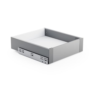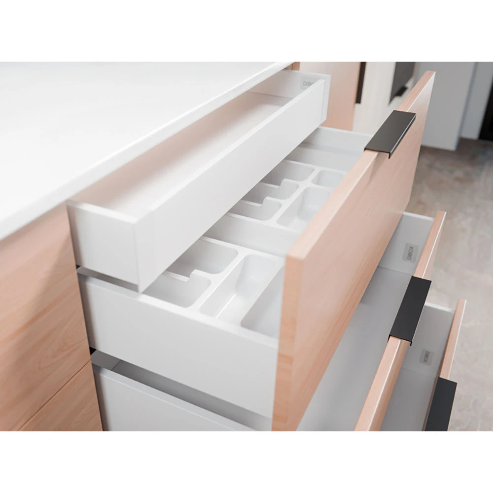 DiBOX is a modern drawer system that allows you to create perfectly fitted drawers for your kitchen. It consists of thin-walled components designed for installation on commonly used 16 mm wooden boards. The range includes sides with push-to-open or soft-close slides (featuring 3D adjustment and durability up to 80,000 cycles), as well as inner fronts - including versions adapted for glass installation.
