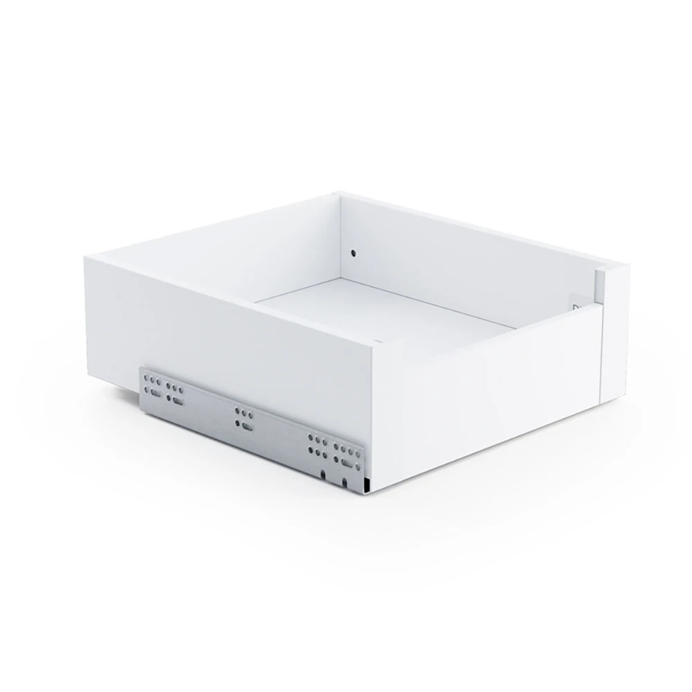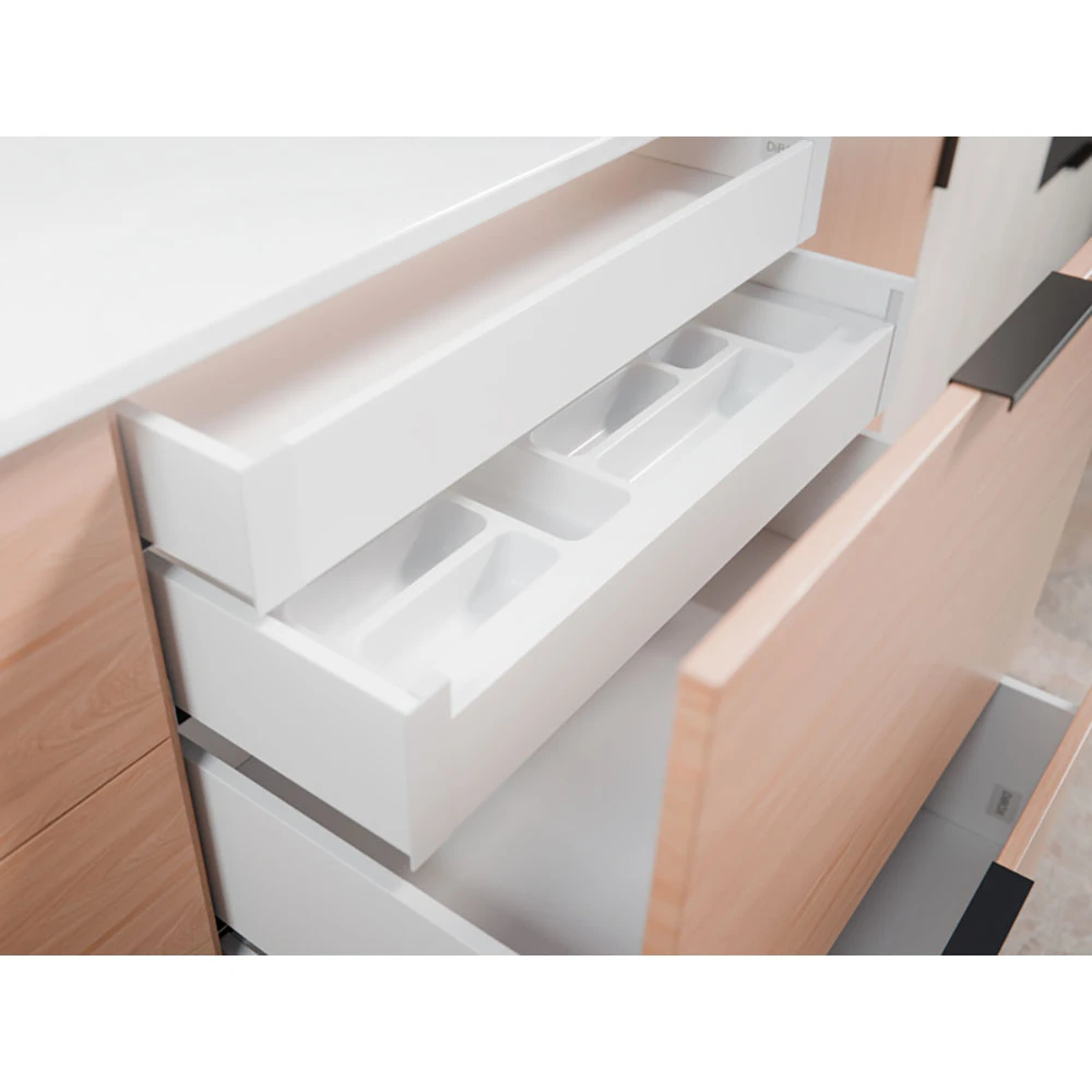DiBOX is a modern drawer system that allows you to create perfectly fitted drawers for your kitchen. It consists of thin-walled components designed for installation on commonly used 16 mm wooden boards. The range includes sides with push-to-open or soft-close slides (featuring 3D adjustment and durability up to 80,000 cycles), as well as inner fronts - including versions adapted for glass installation.