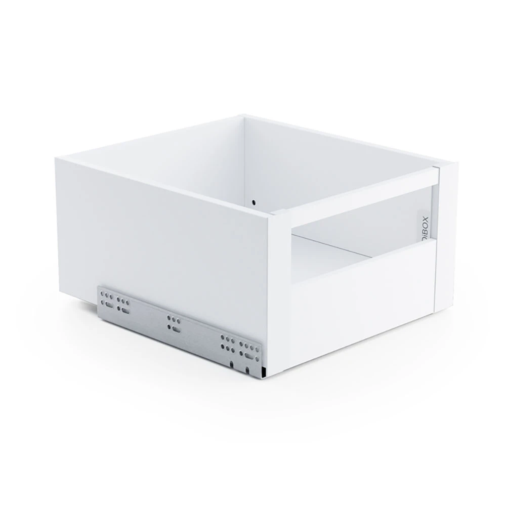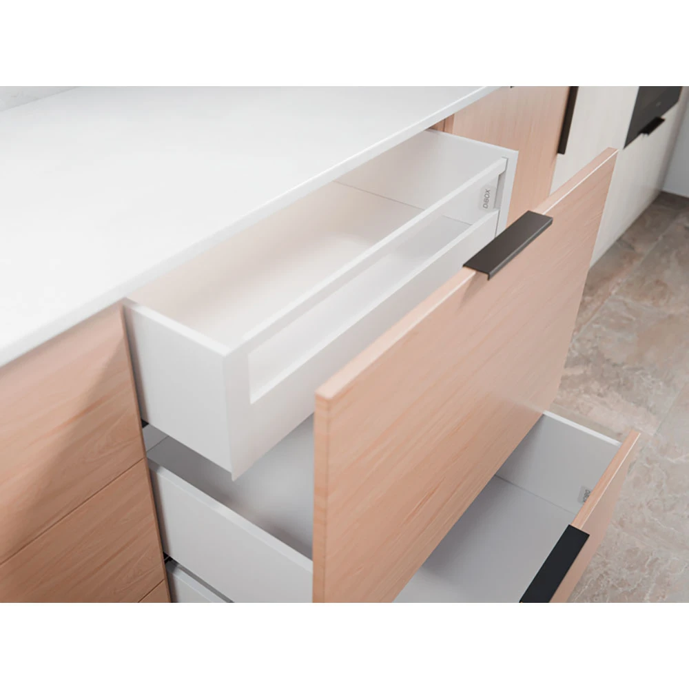 DiBOX is a modern drawer system that allows you to create perfectly fitted drawers for your kitchen. It consists of thin-walled components designed for installation on commonly used 16 mm wooden boards. The range includes sides with push-to-open or soft-close slides (featuring 3D adjustment and durability up to 80,000 cycles), as well as inner fronts - including versions adapted for glass installation.