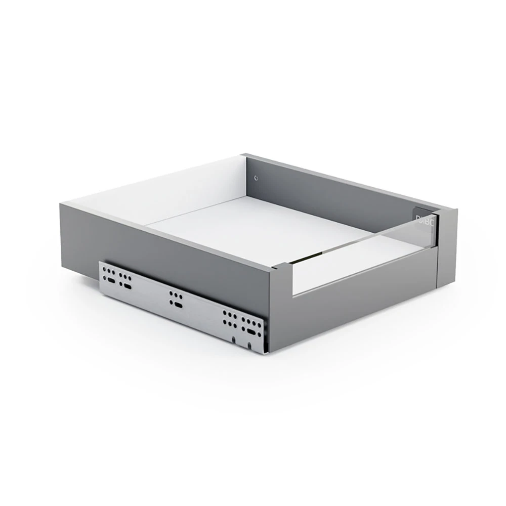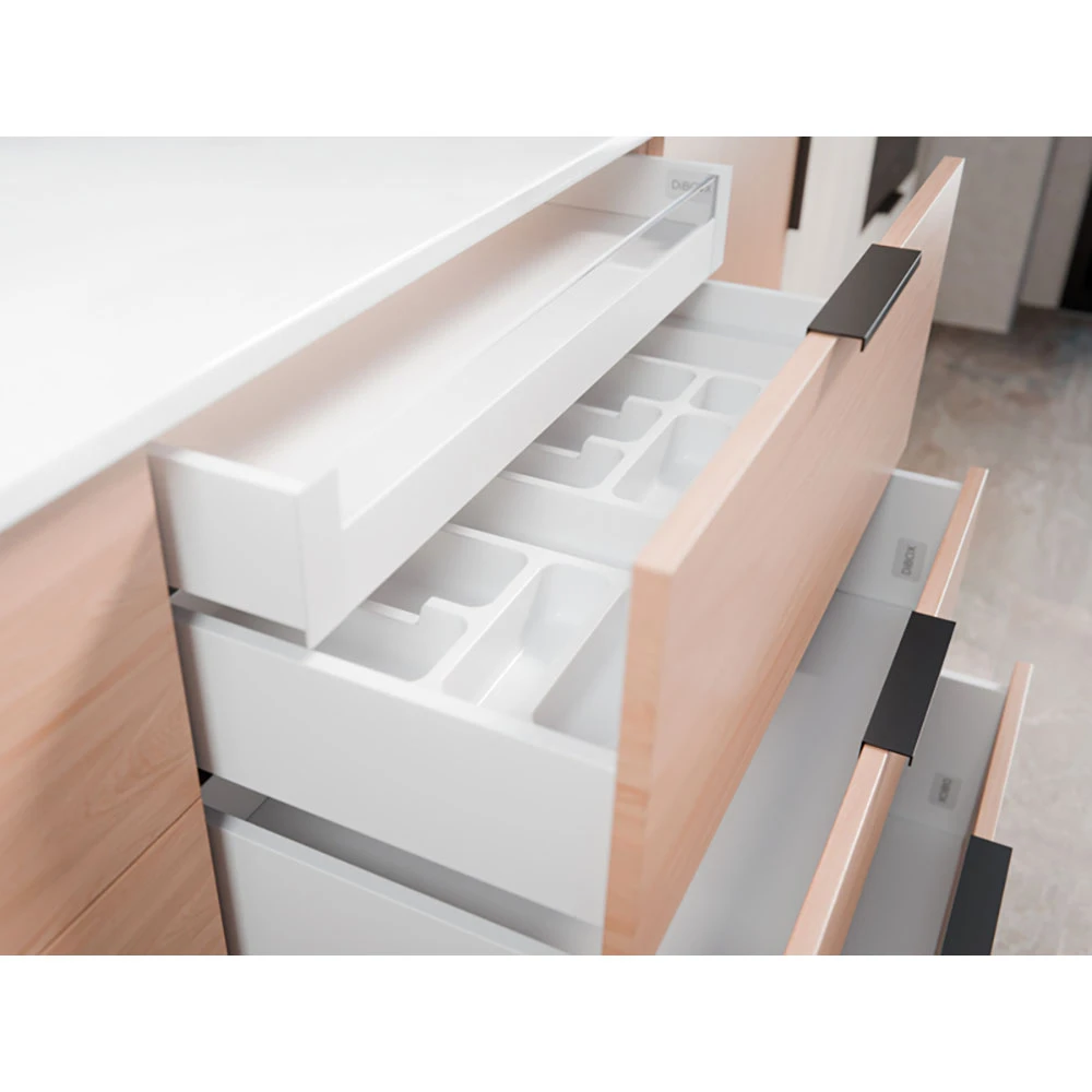 DiBOX is a modern system that allows you to create perfectly fitted drawers for your kitchen. It consists of thin-walled components designed for mounting on popular 16 mm thick wooden boards. The range includes sides with push-to-open or soft-close runners (with 3D adjustment and durability of up to 80,000 cycles), as well as inner fronts - including versions designed for use with glass.