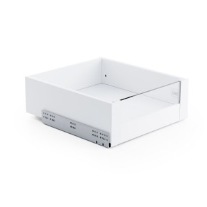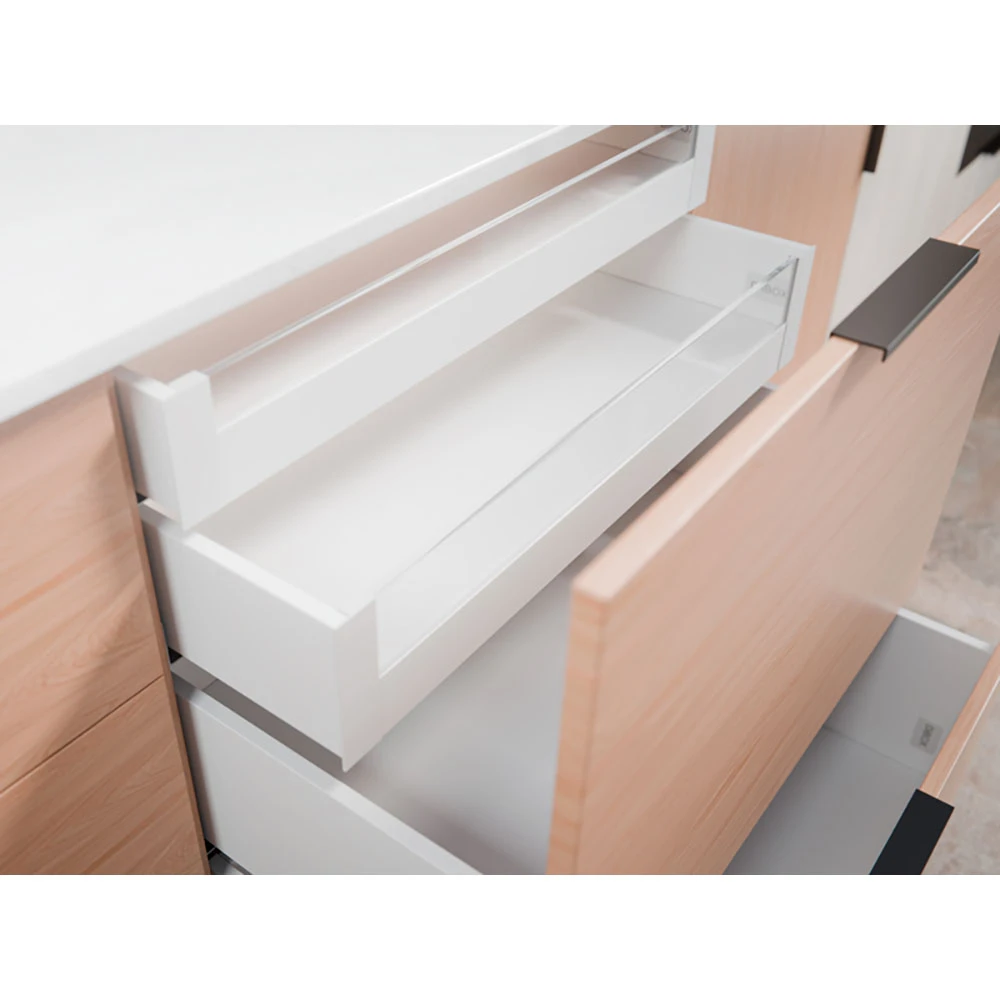 DiBOX is a modern system that allows you to create perfectly fitted drawers for your kitchen. It consists of thin-walled components designed for mounting on popular 16 mm thick wooden boards. The range includes sides with push-to-open or soft-close runners (with 3D adjustment and durability of up to 80,000 cycles), as well as inner fronts - including versions designed for use with glass.
