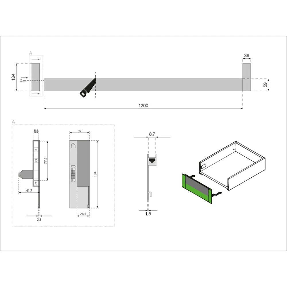 The drawer front can be cut to the required length, allowing it to be perfectly fitted to non-standard cabinet widths. This provides greater flexibility in furniture design.