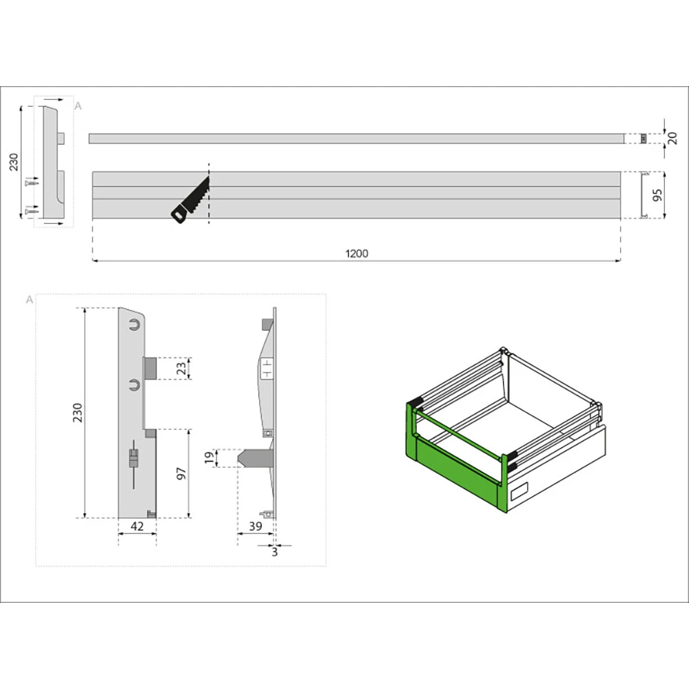 The drawer front can be cut to the required length, allowing for perfect fitting to non-standard cabinet widths. This gives you greater flexibility when designing your furniture setup.