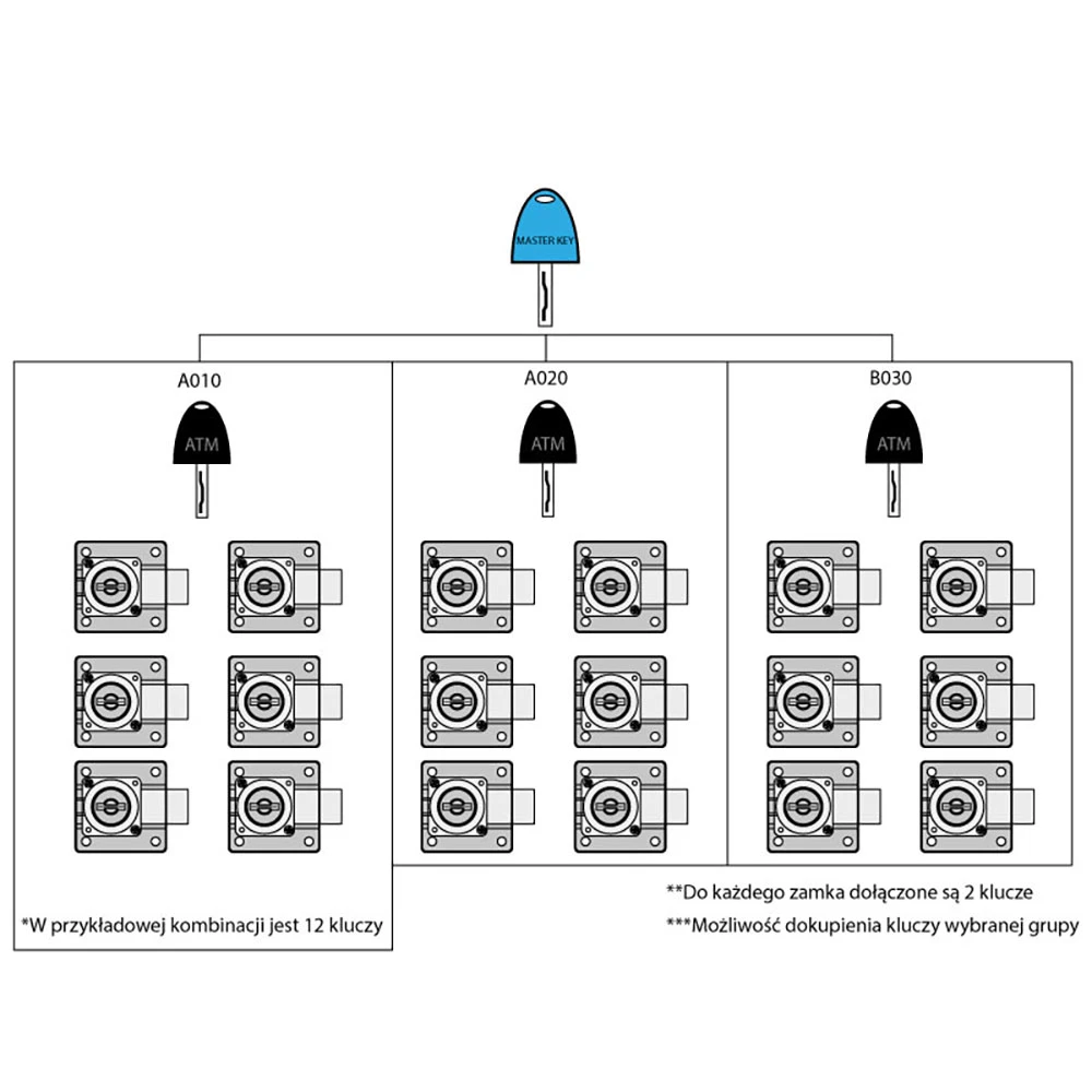 The one-key system allows the division of locks and keys into multiple groups tailored to the individual needs of the user. This simplifies access control for cabinets and drawers, enabling the creation of personalized groups and subgroups. It ensures that only authorized individuals have access to the contents of the cabinets.