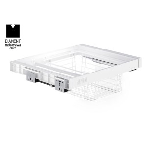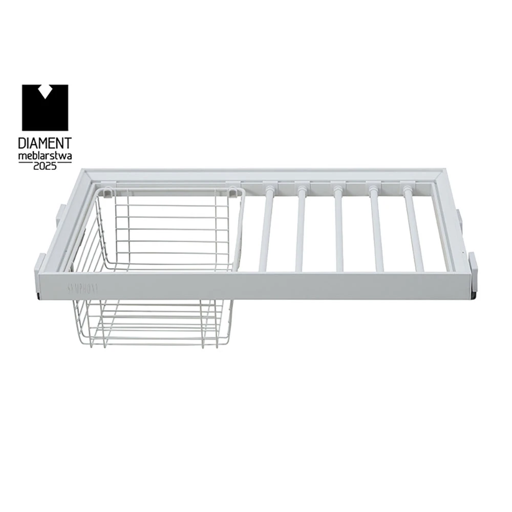 The WB-663 pants hanger with basket is an excellent hybrid solution for storing trousers on the hanger and clothing or underwear in the basket. It features a minimalist design and elegant construction, making it a perfect fit for any modern interior, adding a luxurious and fresh look. Equipped with a bottom mount guide (featuring concealed fixing), it ensures that every wardrobe interior is presented elegantly.