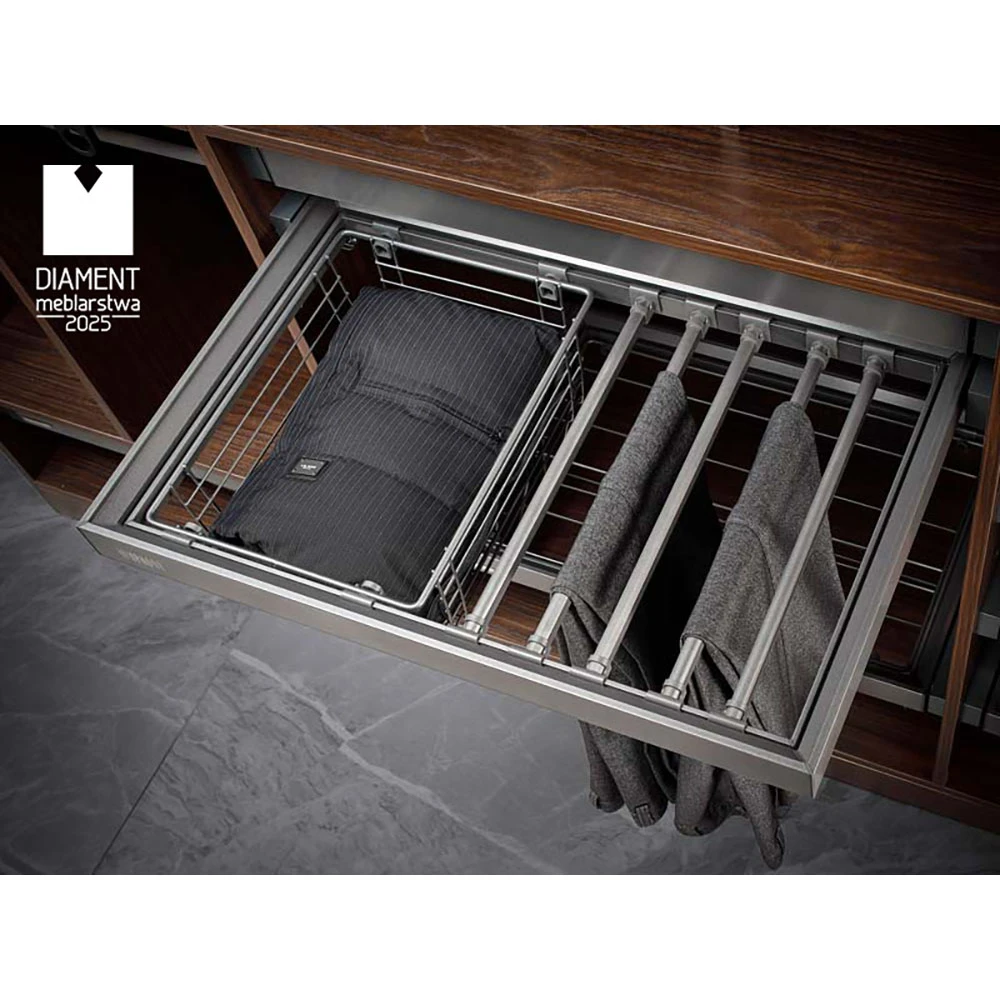 The WB-663 pants hanger with basket is an excellent hybrid solution for storing trousers on the hanger and clothing or underwear in the basket. It features a minimalist design and elegant construction, making it a perfect fit for any modern interior, adding a luxurious and fresh look. Equipped with a bottom mount guide (featuring concealed fixing), it ensures that every wardrobe interior is presented elegantly.