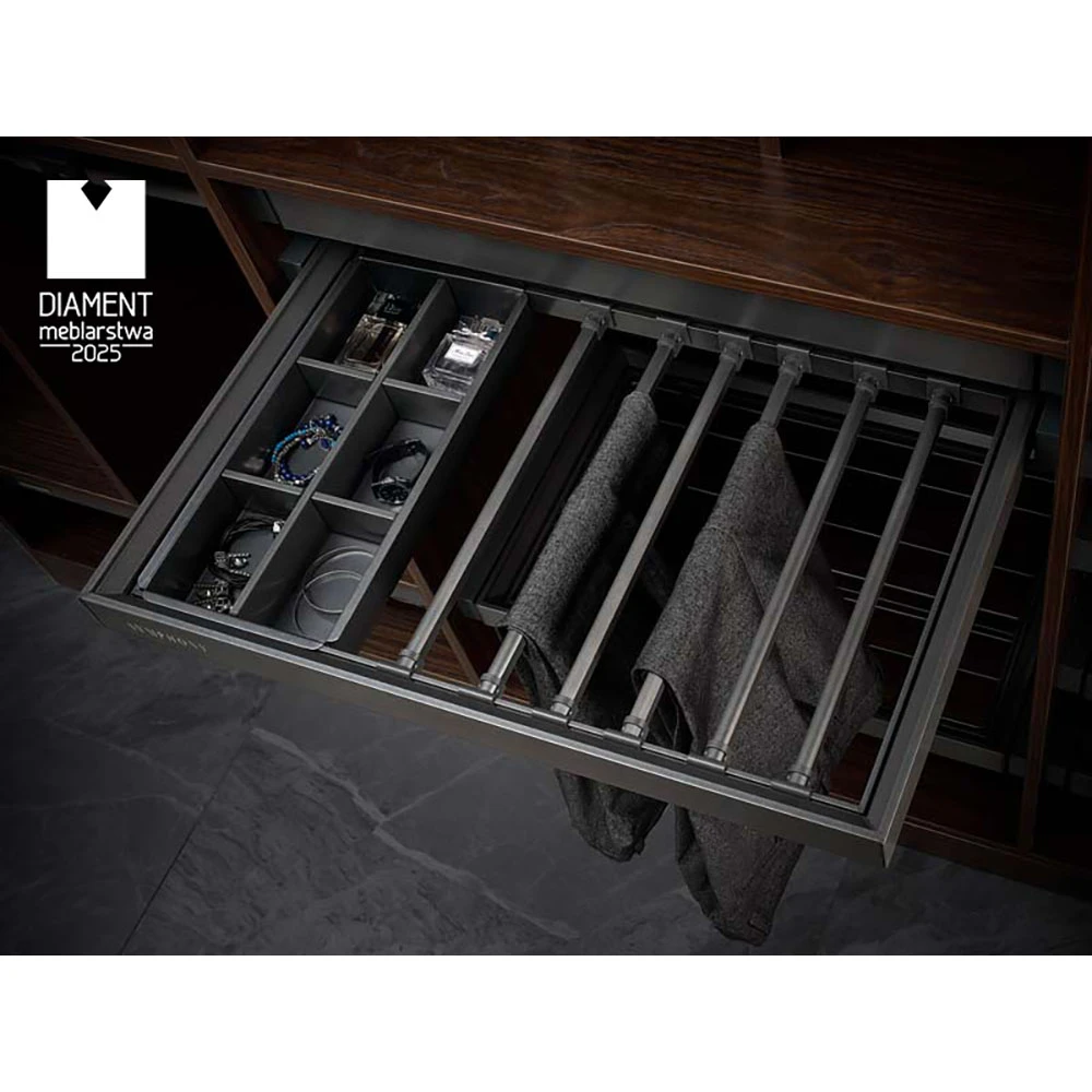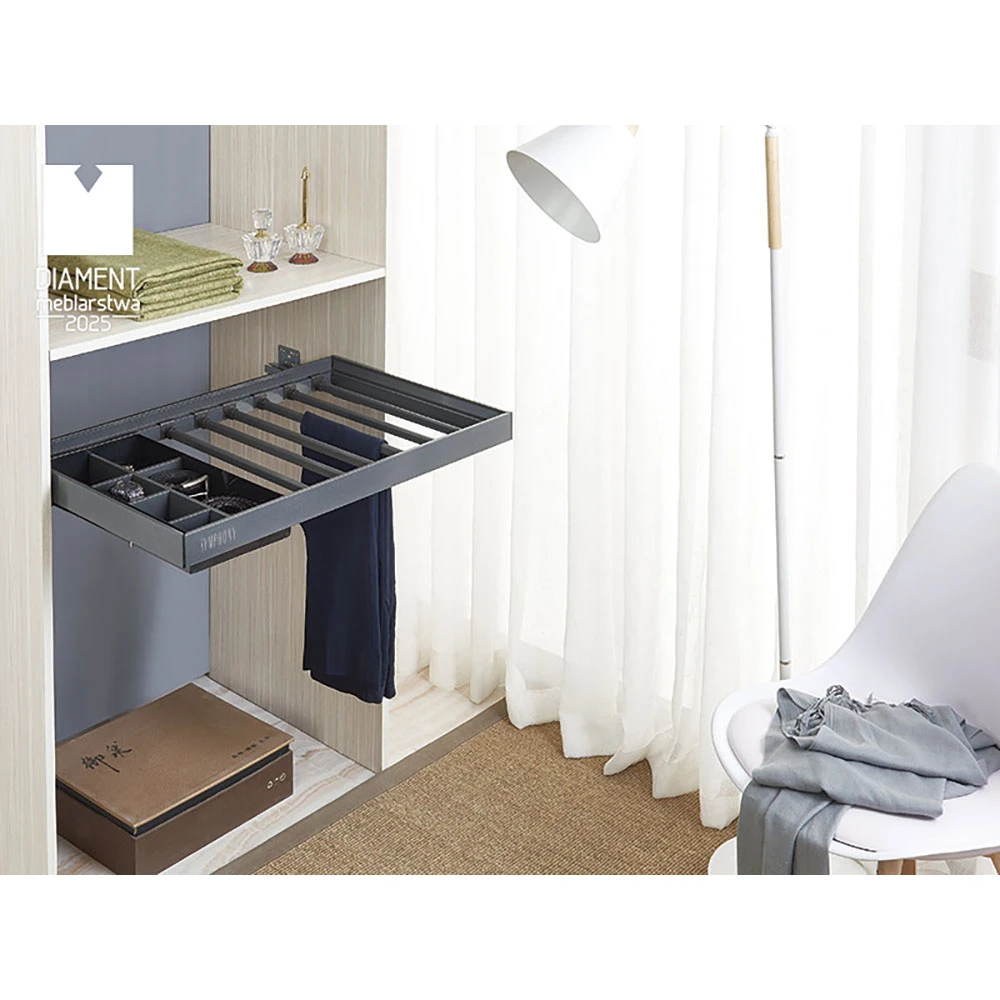 WB-664 features a minimalist design and elegant construction, making it a perfect fit for any modern interior, adding a luxurious and fresh look. Equipped with a concealed mounting slide, it ensures that every wardrobe interior looks stylish.