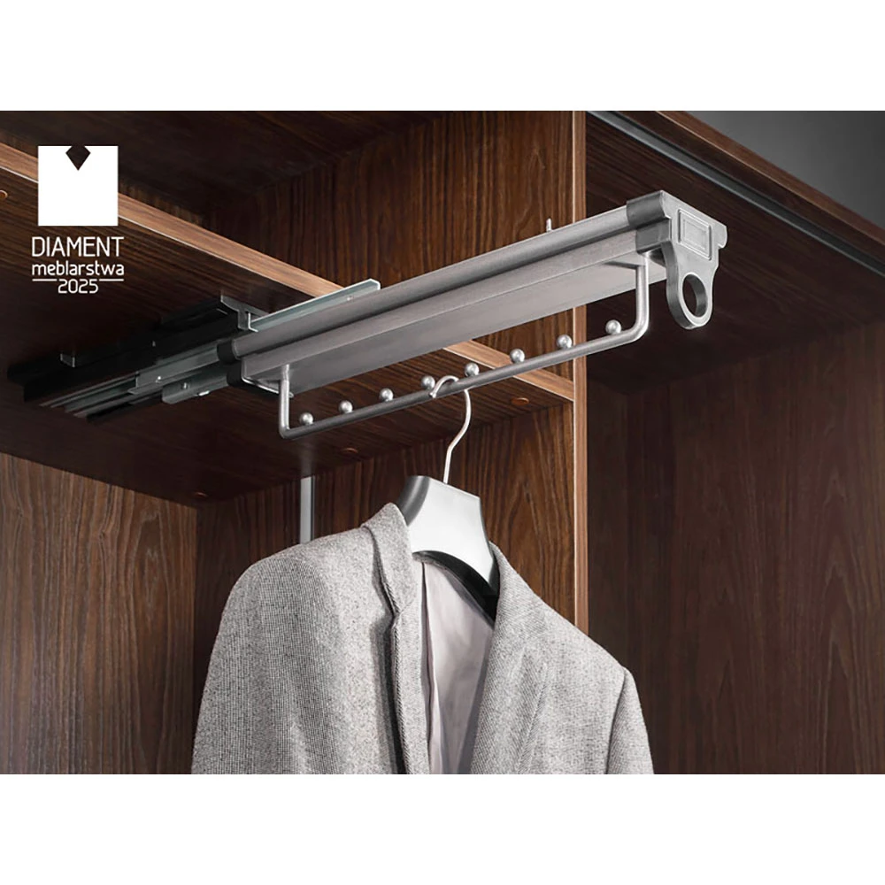 This model, part of the SYMPHONY series, like other products in this line, features a full extension system. This allows you to fully extend the hanger from the wardrobe, making it easy to access all stored items, even those at the very back.