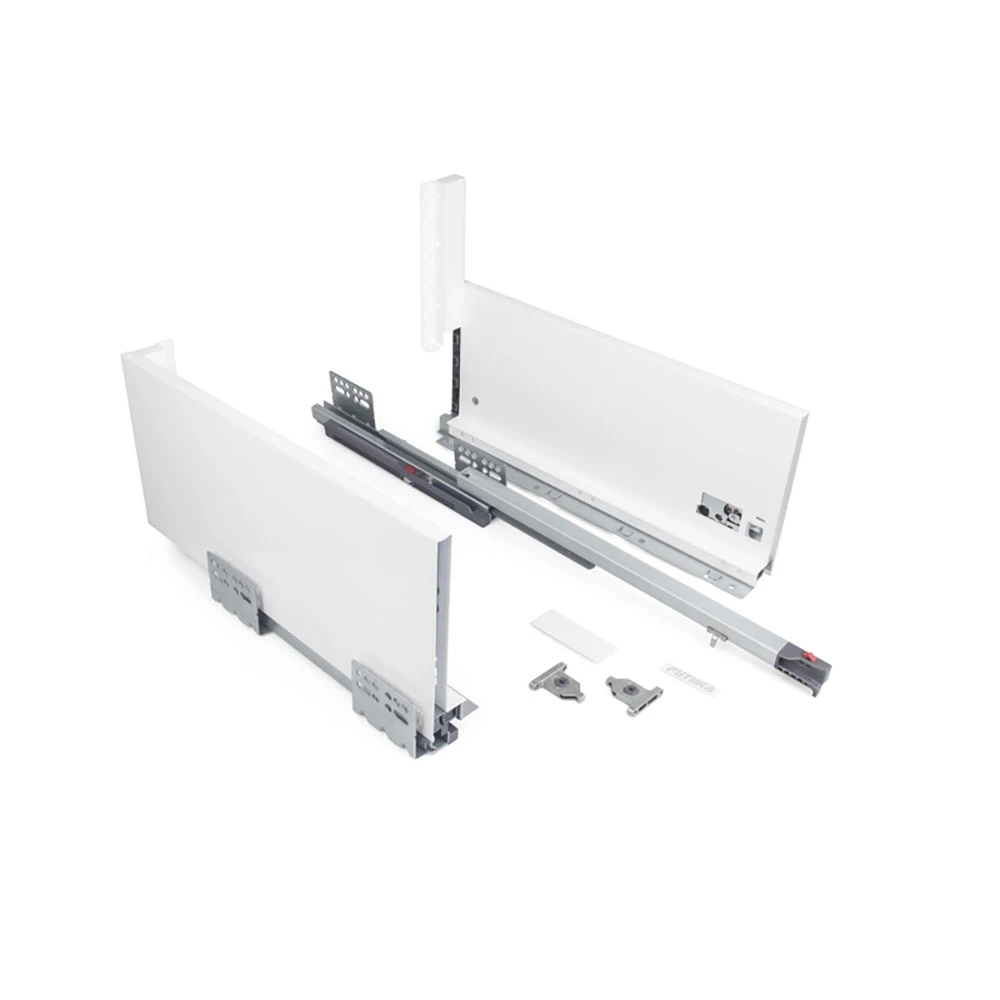 Specjalnie zaprojektowane prowadnice synchronizują ruch boków szuflady, co zapewnia jej płynne i ciche działanie. Dodatkowo, wąski bok o szerokości zaledwie 14 mm pozwala na optymalne wykorzystanie dostępnej przestrzeni, zapewniając więcej miejsca na przechowywanie. Dzięki temu wnętrze szuflady staje się bardziej pojemne, a jej design pozostaje elegancki i nowoczesny.