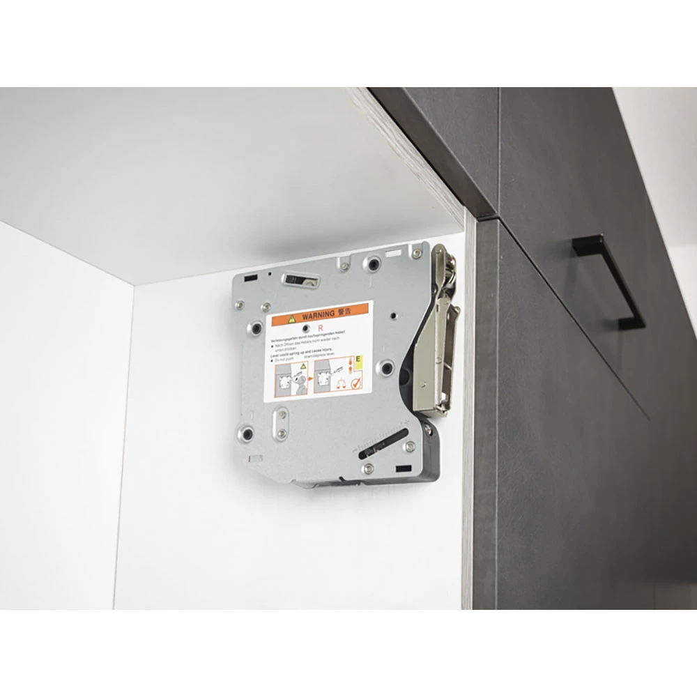 Podnośnik SkyUp umożliwia łatwe i płynne podnoszenie oraz opuszczanie frontów, obsługując obciążenie od 3,5 do 5 kg na jeden podnośnik. Mechanizm doskonale sprawdzi się w kuchni, łazience oraz innych pomieszczeniach, gdzie stosowane są szafki z podnoszonymi frontami.