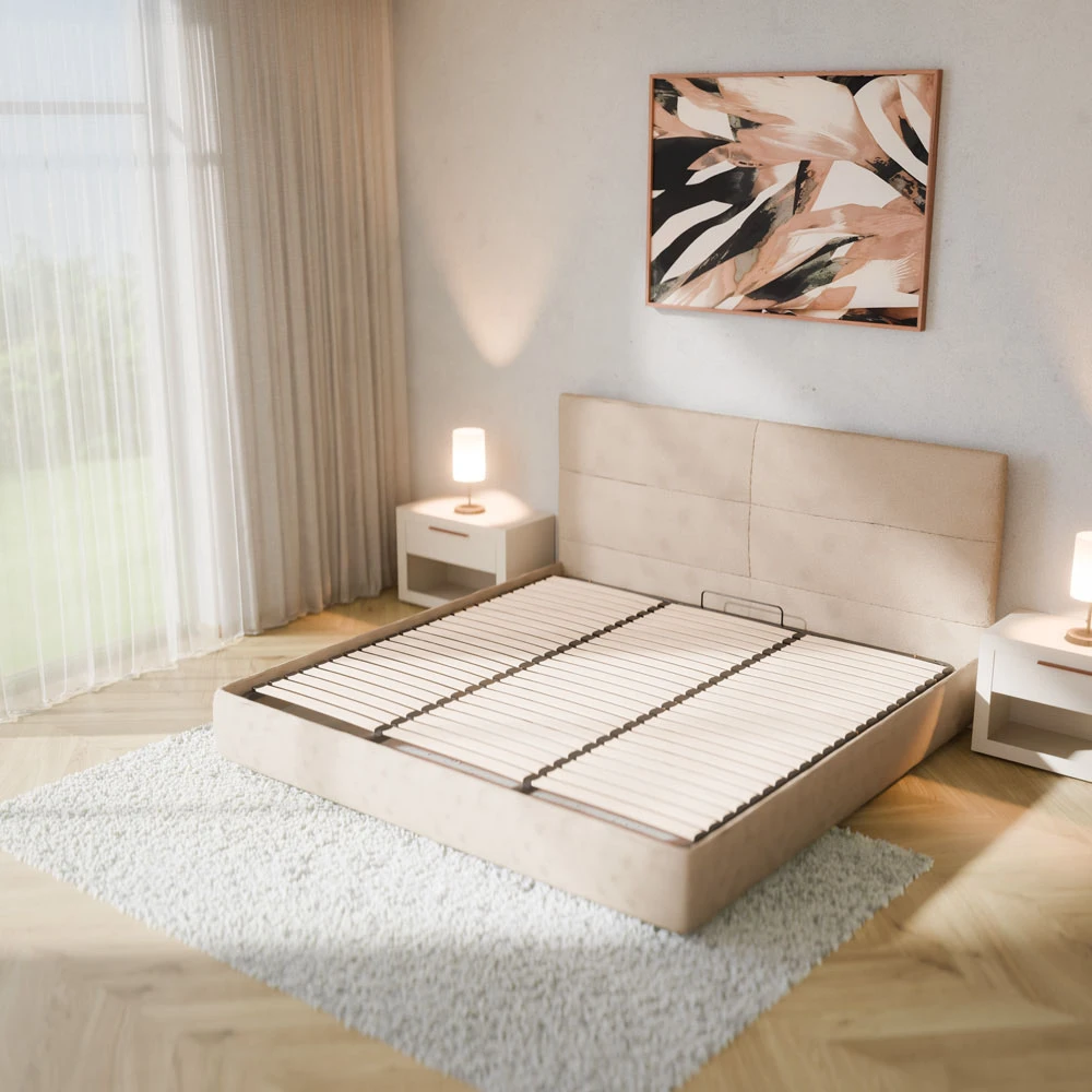 Stelaż do łóżka posiada ramę wykonaną ze stali o wymiarach zewnętrznych 2000×2000 mm.